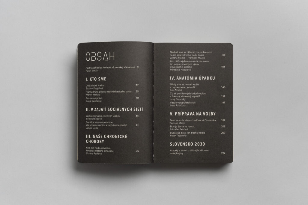 Editorom projektu je spisovateľ a publicista Pavel Sibyla. V knihe si prečítate eseje, v ktorých sa autorský kolektív často dopĺňa, inokedy si protirečí alebo upriami vašu pozornosť na tému, ktorej dôležitosť si v každodennom zhone nestíhate uvedomiť. Texty sa dotýkajú tém ako politika, školstvo, zdravotníctvo, sociálne siete, ekonomika, korupcia či právny štát.